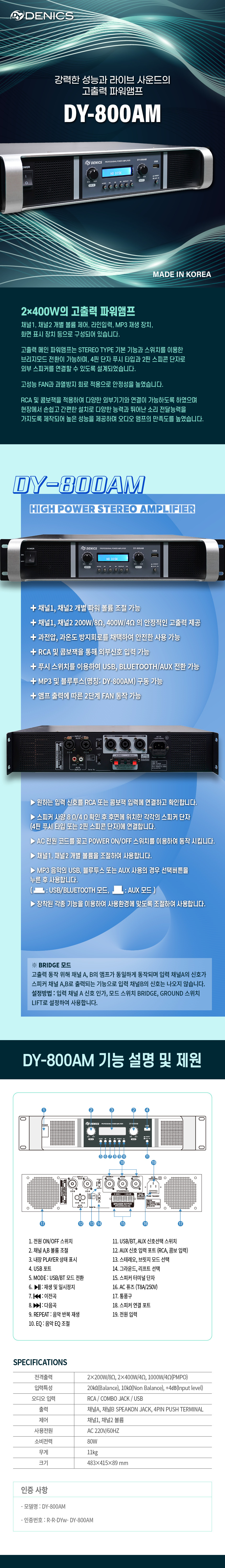 - 고출력 메인 파워앰프는 STEREO TYPE 기본 기능과 스위치를 이용한 브리지모드 전환이 가능하며, 4핀 단자 푸시 타입과 2핀 스피콘 단자로 외부 스피커를 연결할 수 있도록 설계되었습니다.
